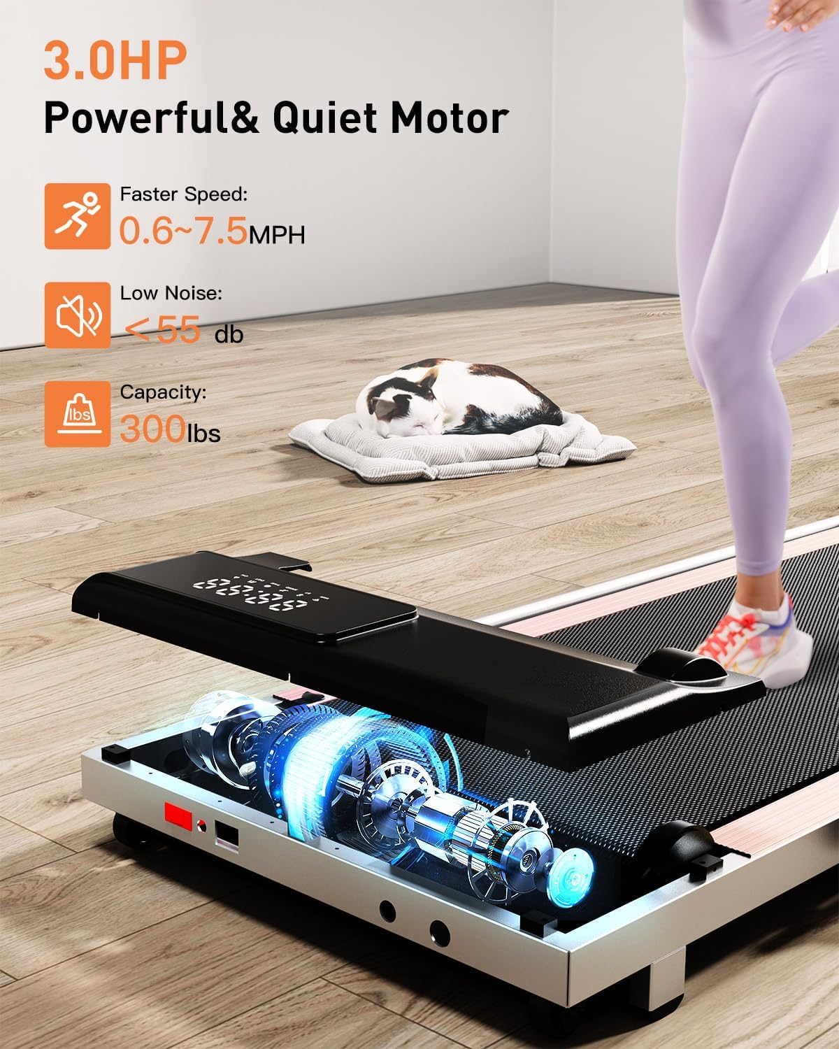 【Not Only Walking Pad But Also Treadmill】3.0HP powerful but quiet treadmills for home, low noise< 55db, 300lbs capacity folding treadmills for home: when the riser is down, it is in walking mode, with a speed range of 0.6-3.8MPH; and when the handrail is up, it is running mode, with a speed range of 0.6-7.5MPH; whether walking or running, it can bring you many unexpected experiences.