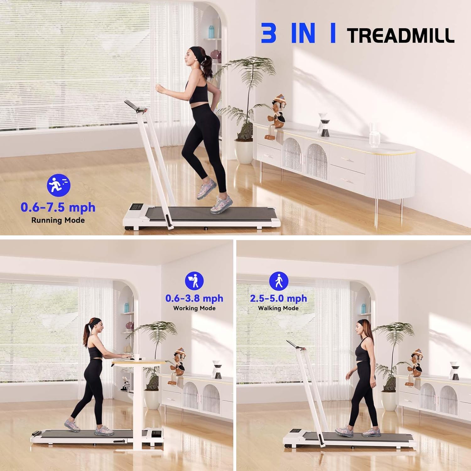 【Innovative 3-in-1 Folding Treadmill】 SupeRun 3-in-1 folding treadmill is different from traditional treadmills. Walking/ Joging/ Running meet your different sports needs. It is not only suitable for people who exercise lightly, but also for moderate to heavy runners.