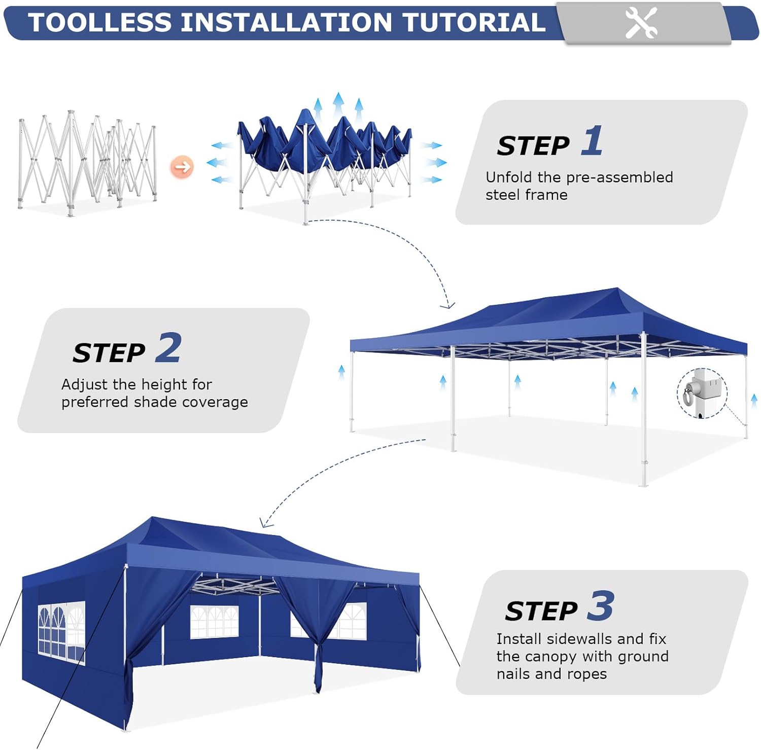【High-quality fabrics and side walls】13×26 heavy duty party tent is made of 550D Oxford with PU coating, which can withstand 1500mm water pressure, 100% waterproof, and blocks 99% of UV rays. 9 pieces of removable sidewalls are connected by a whole strip of hook and loop fastener to top cover and legs of canopy. You can install different number of sidewalls according to your needs.