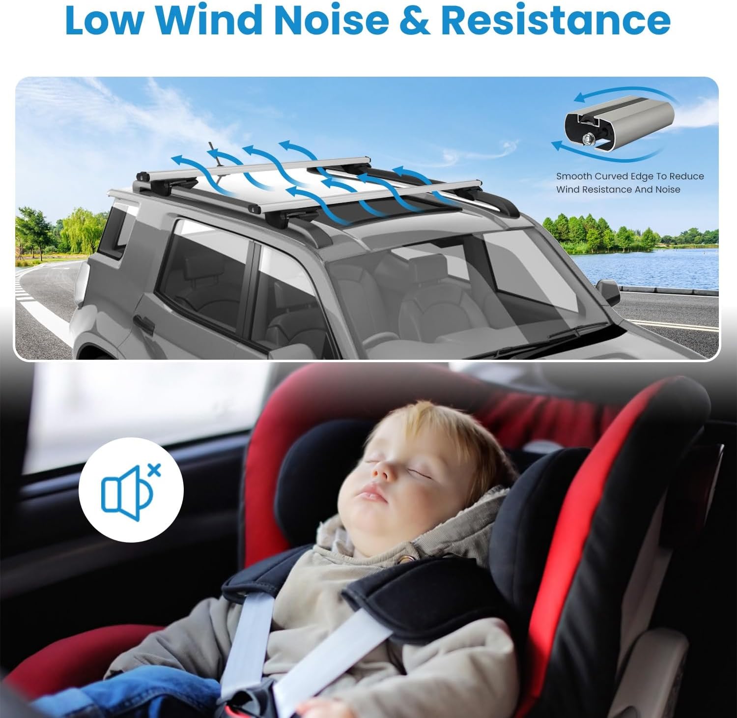 Smooth curved shape in the edges of crossbar can effectively decrease wind noise and resistance and meantime hardly have effect of the beauty of vehicles.
