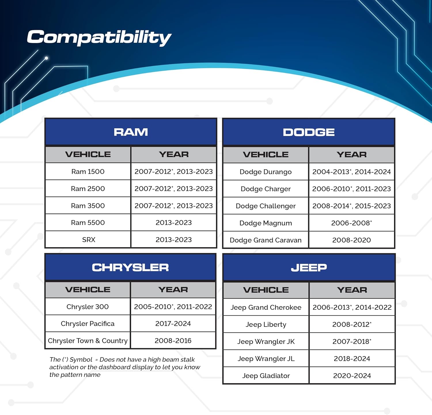 Seamless Integration – Designed for Dodge, Jeep, and Ram vehicles, this flasher module integrates without compromising the vehicle’s integrity and can be removed at any time without leaving a trace.