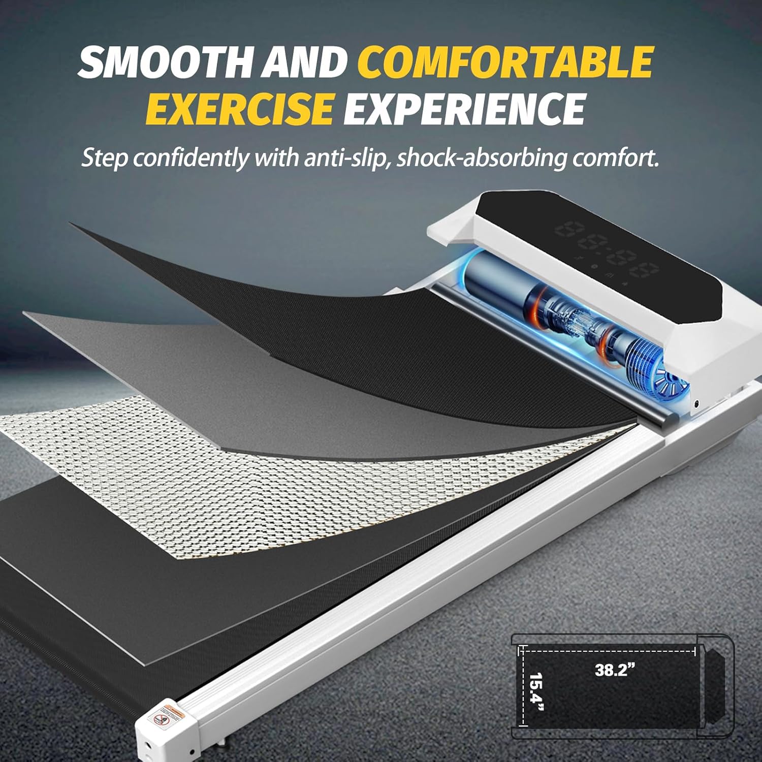 【Shock Absorption & Noise Reduction】The treadmill is equipped with a powerful 2.25HP silent motor, capable of supporting a weight of 220 lbs. It is designed with a durable density board and a multi-layer protective running belt design, minimizing noise and joint impact, and allowing for a quieter, safer, and more stable workout. The running area measures 15.4 x 39.4 inches, perfect for daily use at home and in the office.