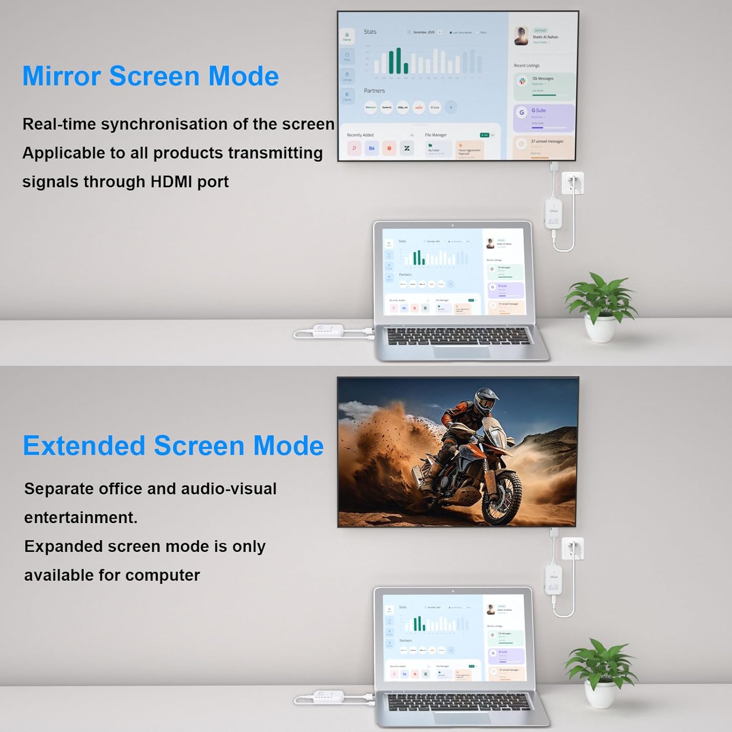 Mirror screen mode: The screen and the emission source are synchronized in real time.Extended screen mode: The monitor is different from the computer screen. The monitor is for watching videos, and the computer screen is for working. It only works on computers.