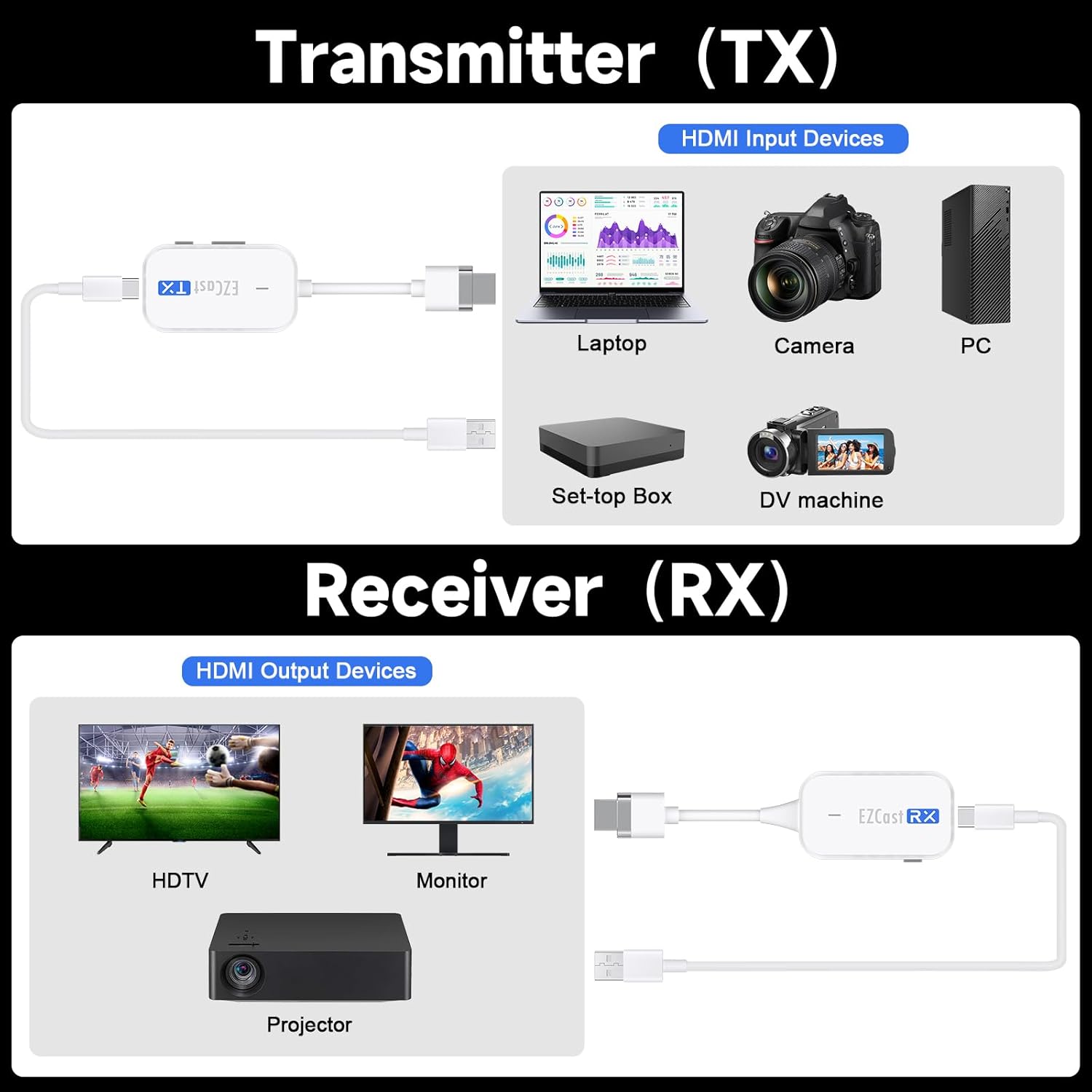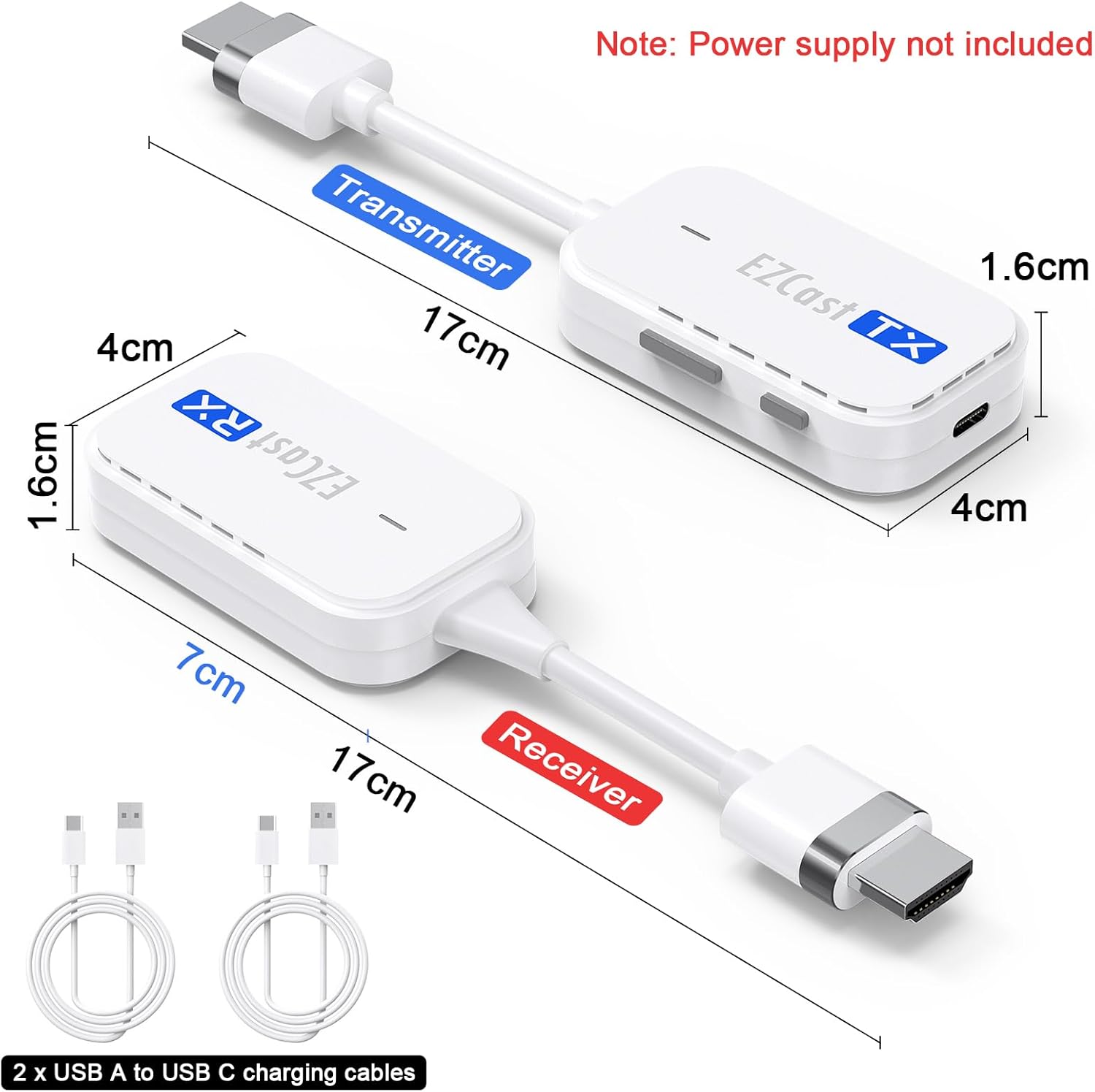 【Warm Tips】Please connect the DC 5V power supply or the USB port of your computer/monitor/TV to power the wireless HDMI transmitter and receiver via USB A to Type-C cable (included). How to get your wireless HDMI extender to re-pair: 1. Press and hold the “Reset” button of the HDMI receiver for 2s until the screen prompts “Ready to Pair” 2. Press and hold the “Pairing” button of the HDMI transmitter for 5s until the LED light on the transmitter goes out and then release it to pair automatically.