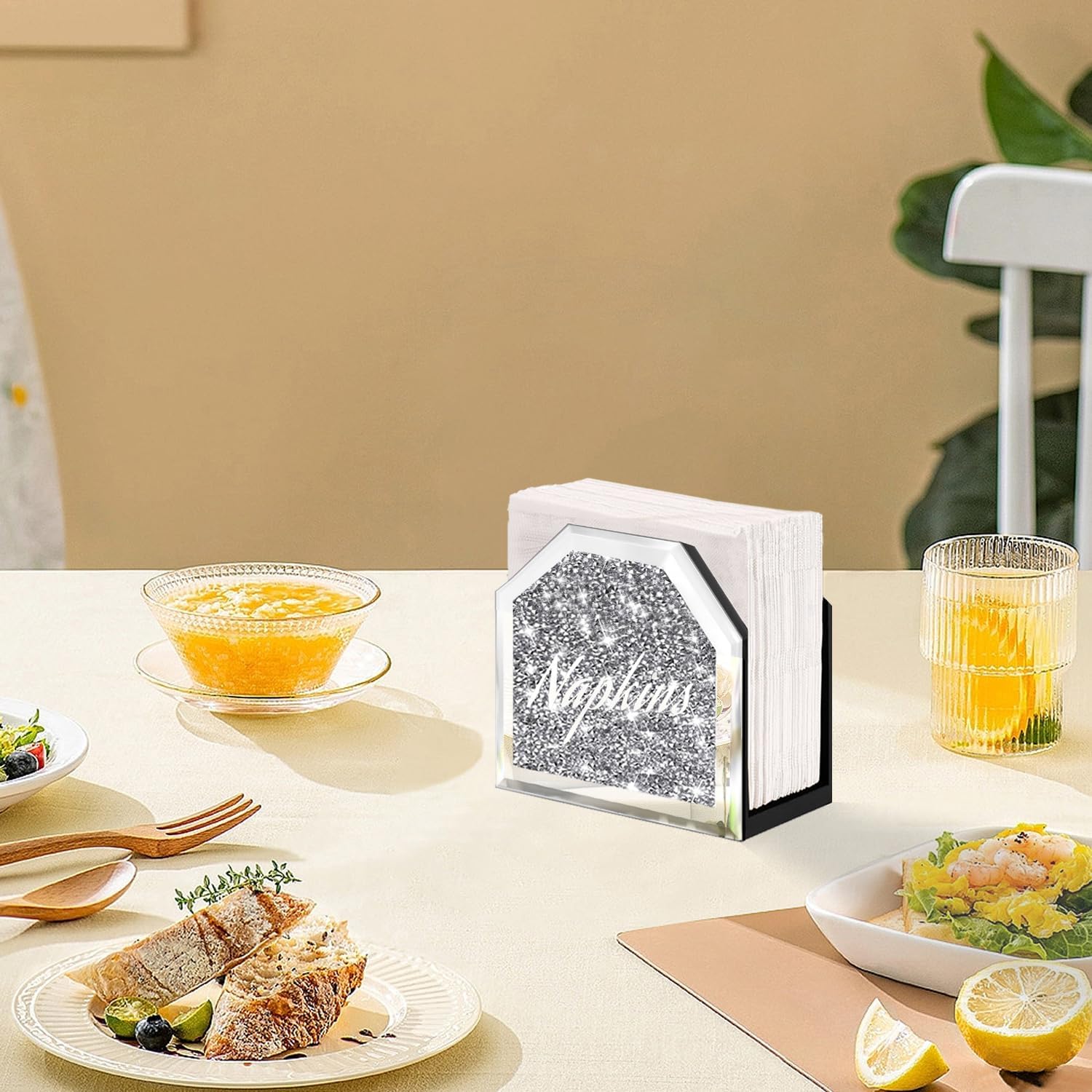 Wocred Mirror Napkin Holder,Crystal Crushed Diamond Vertical Holder,Cute Tissue Holder Holds Napkins Upright for Bathroom,Dining Table,Kitchen Table.(5.9”X5.9”X3”)