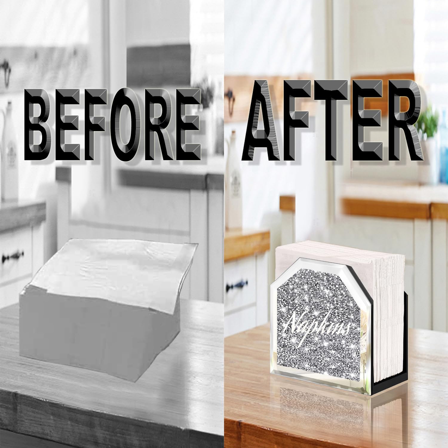 MIRROR NAPKIN HOLDER:The design of the napkin holder is simple,The two sides of it are diamonds, and the glass mirror covers the diamonds.Hold amount of napkins in the middle without it looking messy.Very sturdy and well made.