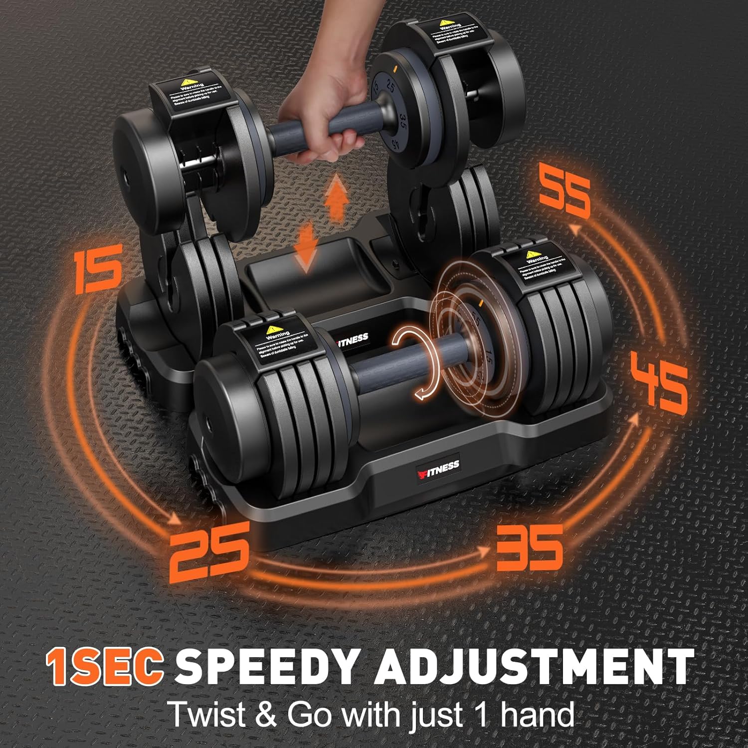 [5-in-1 Adjustable Dumbbell] 15/25/35/45/55LB, with 5 adjustable weight settings, this dumbbell allows you to customize your workout to your individual needs. The weight scale is displayed on the handle, the weight can be adjusted according to your ability, designed to be the ultimate home gym solution for fitness enthusiasts.
