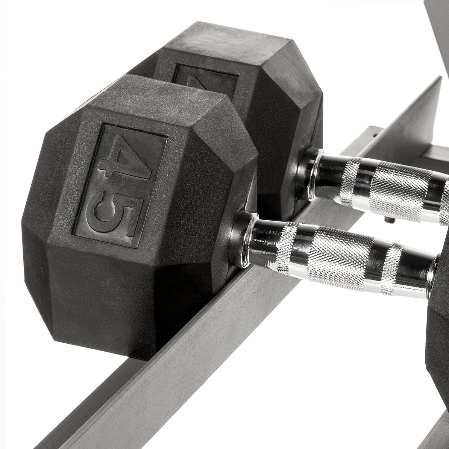 SECURELY STORED: Dumbbells are securely held in place on the rack, ensuring stability and preventing any shifting or movement, providing safe and organized storage for your workout area.