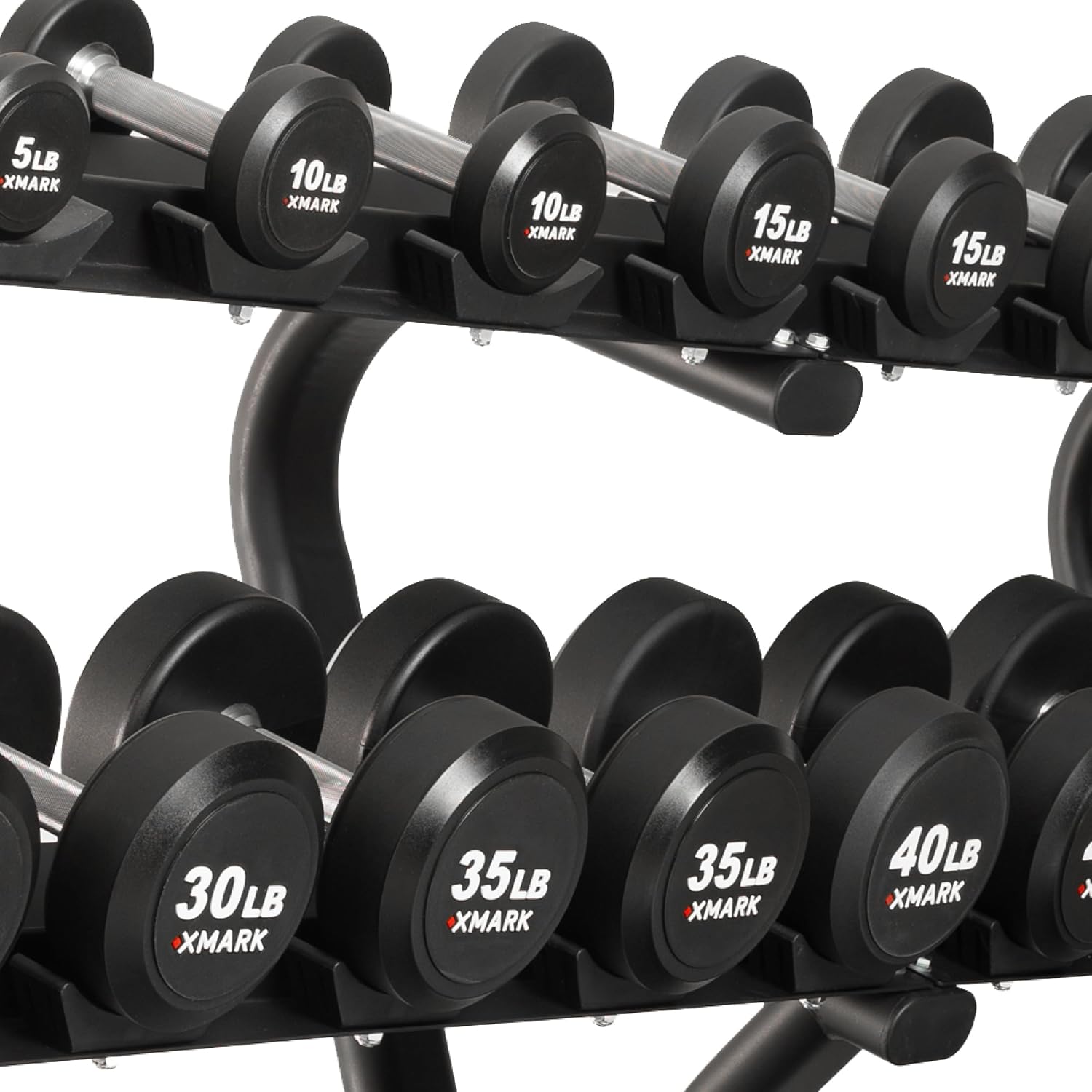 5LB TO 50LB SETS: Our XMARK urethane dumbbell weight sets are also available in a 5lb to 50lb set with 2-tier dumbbell storage rack which holds 10 dumbbell pairs.