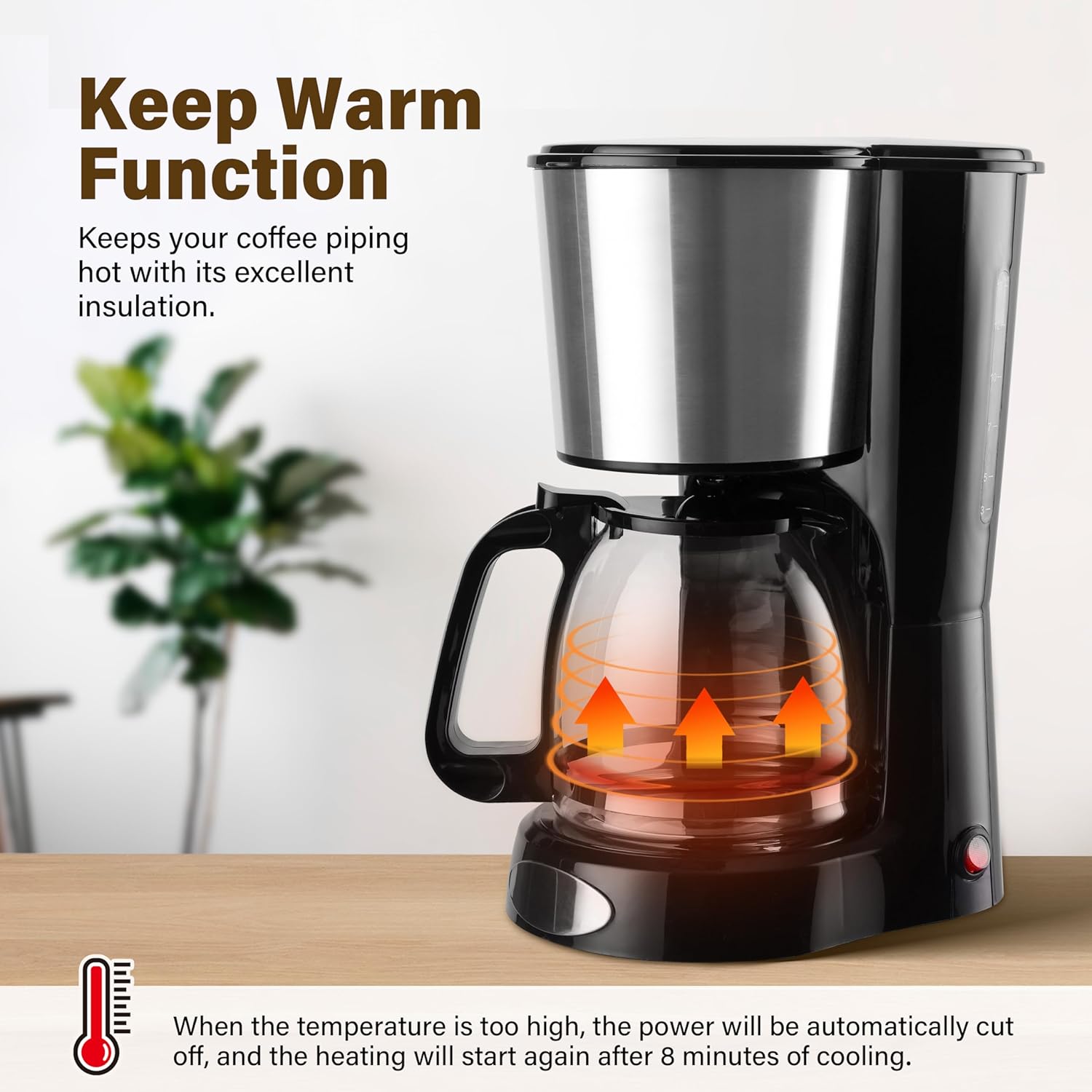 Keep warm function: This coffee pot is equipped with a metal carafe plate to keep the coffee warm after brewing, which helps preserve its taste and aroma for an extended period.